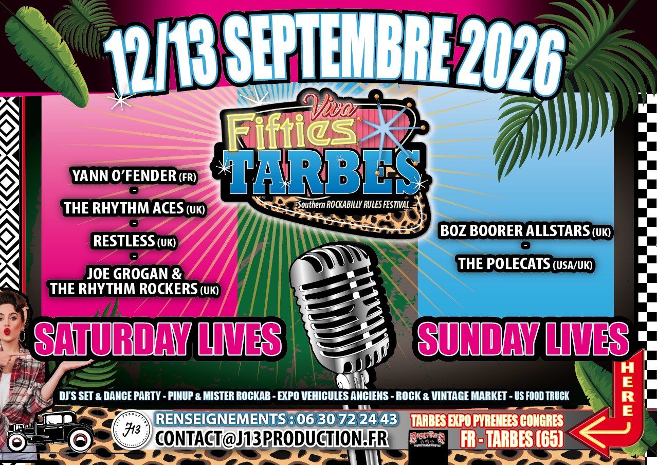 Festival VIVA FIFTIES TARBES 2026, samedi 12 septembre 2026 et dimanche 13 septembre 2026. Concerts rockab, rockabilly, live concert, têtes d'affiches international, car and bike show, election pi-up, stands rock, village food truck, village tattoo, show & spectacle, danse rock... de texte